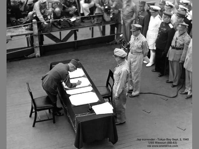 General Yoshijiro Umezu, Chief of the Army General Staff, signs the Instrument of Surrender on behalf of Japanese Imperial General Headquarters, on board USS Missouri (BB-63),